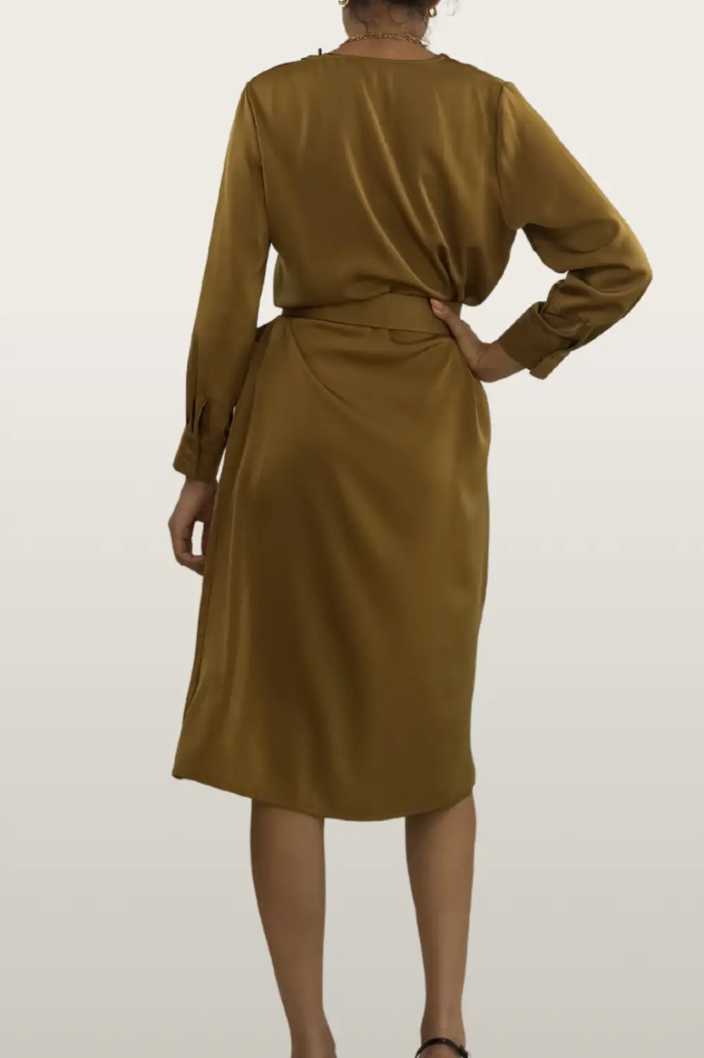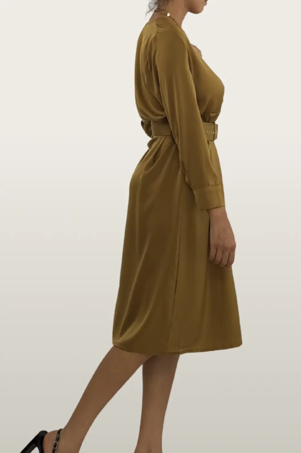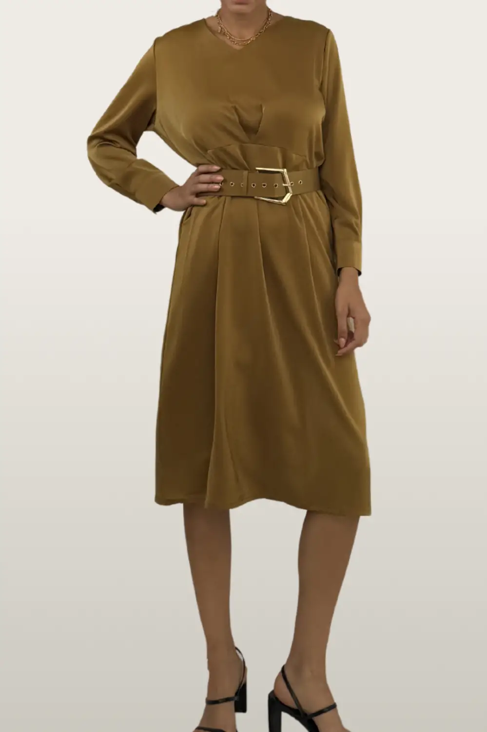 שמלת VIEW מסאטן יוקרתית זו, בגזרתה הצנועה והאלגנטית, מציגה שילוב מושלם של שיק קלאסי ונוחות. היא עשויה סאטן איכותי בעל ברק עדין בצבע חרדל עשיר, וכוללת חגורת מותן מחמיאה ואבזם מוזהב. אידיאלית לאירועים מגוונים, השמלה משדרת יוקרה מאופקת וסטייל נצחי.