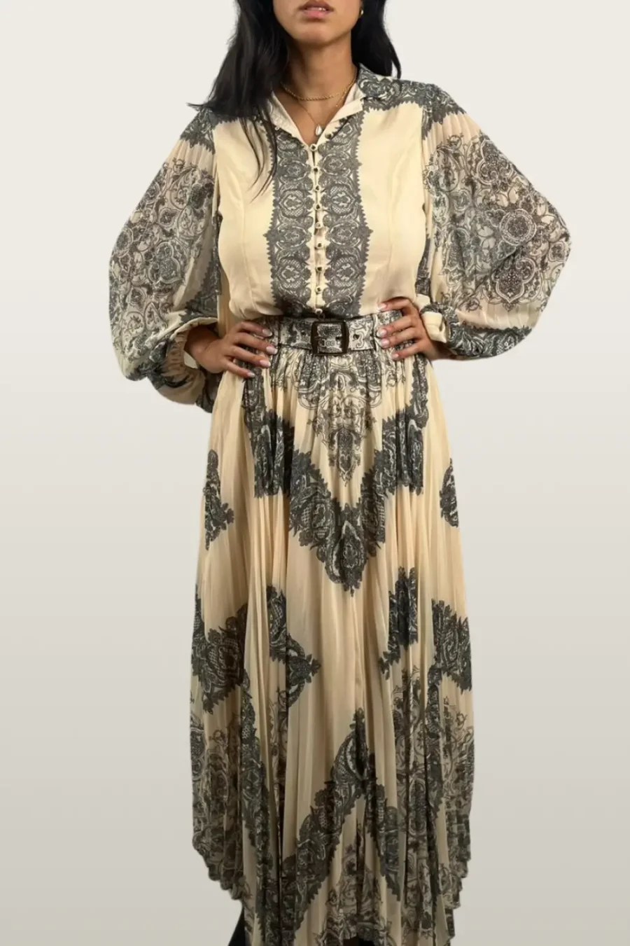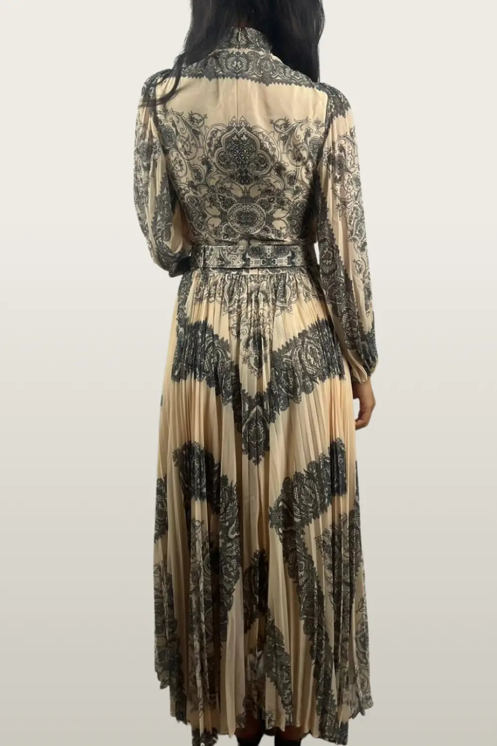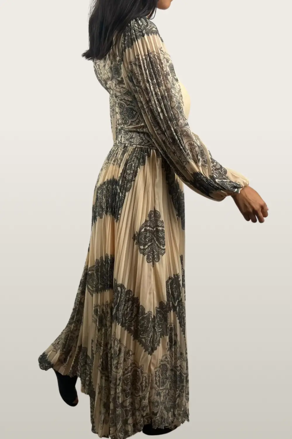 חליפת הפליסה הזו משדרת יוקרה וסטייל בוהמייני-אלגנטי, עם הדפס מודגש על רקע בהיר שיוצר מראה ייחודי ומלא שיק. הגזרה הרחבה והנופלת לצד חגורת המותן המשלבת עידון ונוחות, הופכות אותה לבחירה מושלמת לאירועים מיוחדים ולמראה יום-יומי יוקרתי.