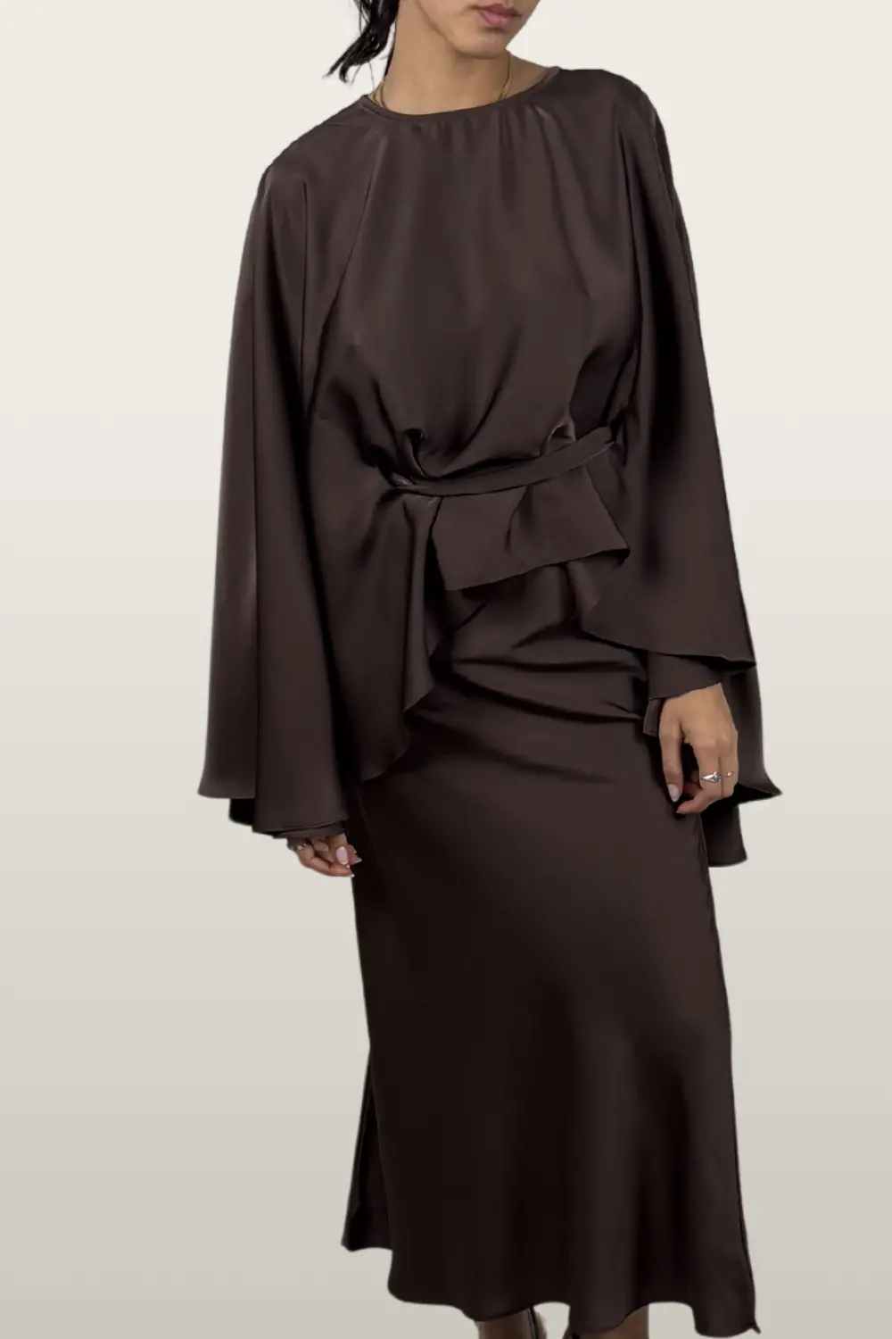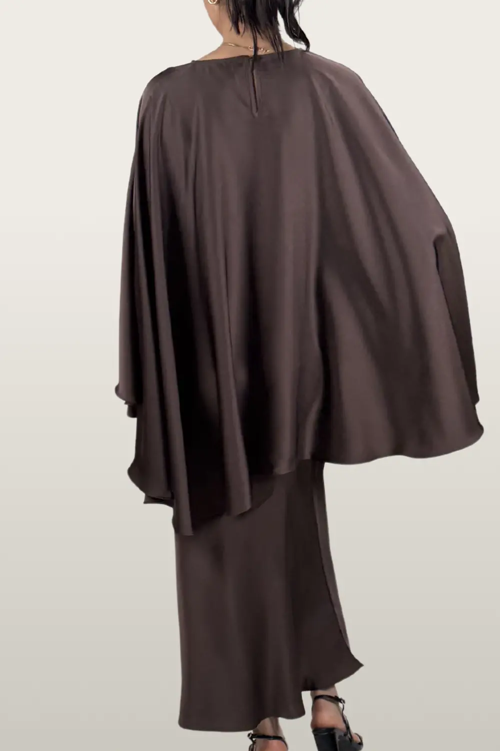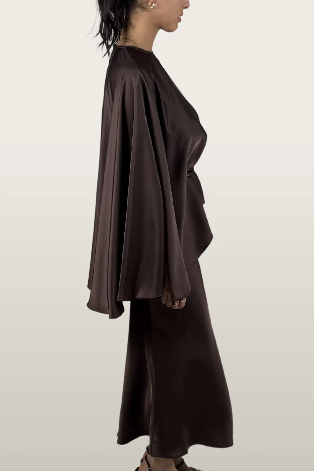 גזרה: שכמייה עם סגירה מתכווננת בקשירה, חצאית סאטן באורך מחמיא