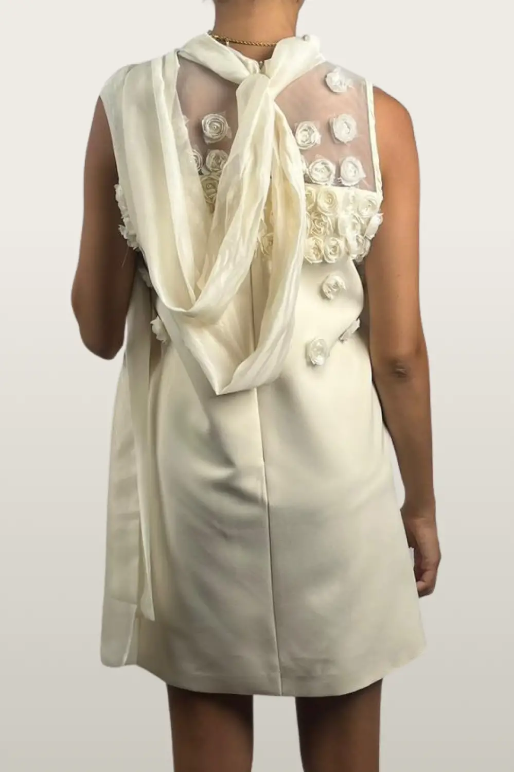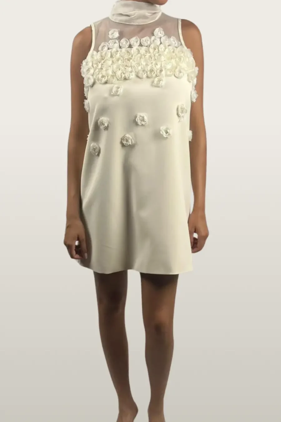 שמלת המיני/טוניקה האלגנטית מציגה עיצוב ייחודי עם פרחי תלת מימד בולטים בחזית, וצווארון וואל גבוה הממשיך לשני סרטים ארוכים בגב, אותם ניתן לקשור לקשת עדינה או להשאיר משוחררים למראה דרמטי. גזרתה המינימליסטית והשיקית הופכת אותה לפריט מושלם לאירועים מיוחדים, המשלב עדינות עם נוכחות מרשימה.