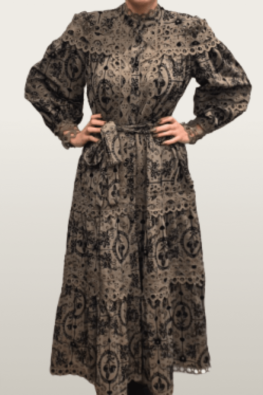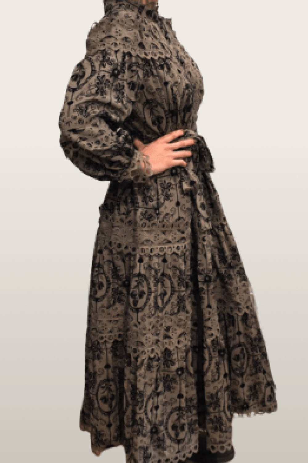 שמלת מקסי מרהיבה ברוח המותג Zimmermann, העשויה מתחרת Guipure עשירה ואיכותית המשלבת רקמות אורנמנטליות בגווני שחור ובז'. היא מתאפיינת בגזרה נשית עם חגורת מותן מחטבת, צווארון אצילי ושרוולי פאף דרמטיים המעניקים מראה ויקטוריאני מודרני. פריט יוקרתי ומדויק המשלב אומנות טקסטיל עם תחכום בוהמיאני, מושלם לאירועי בוטיק וערב.
