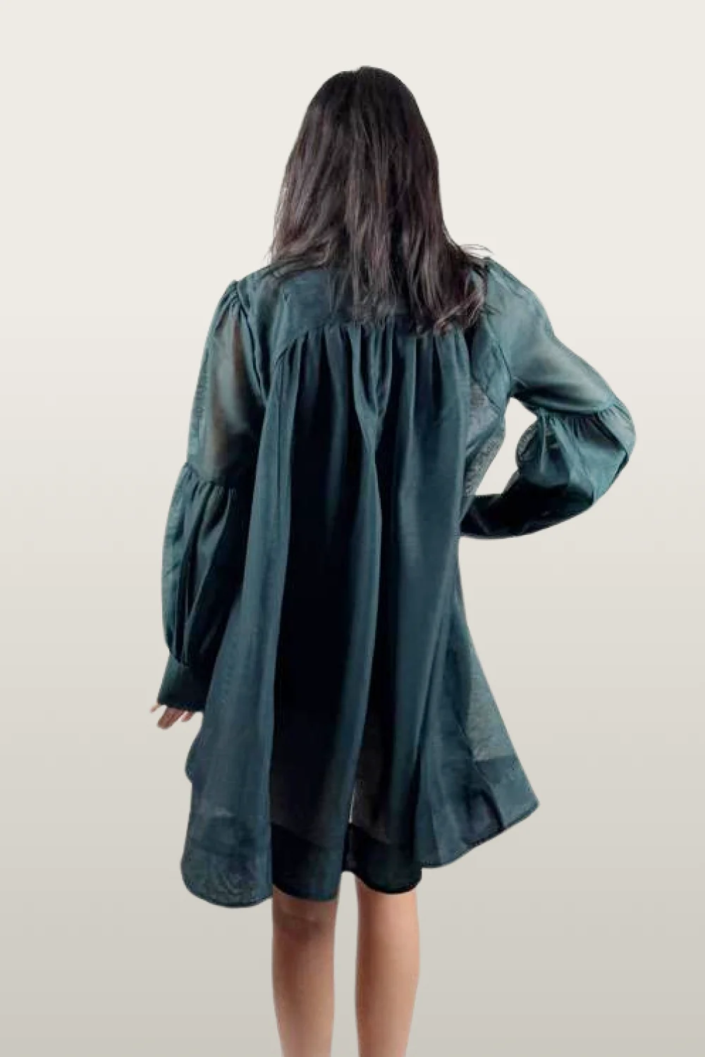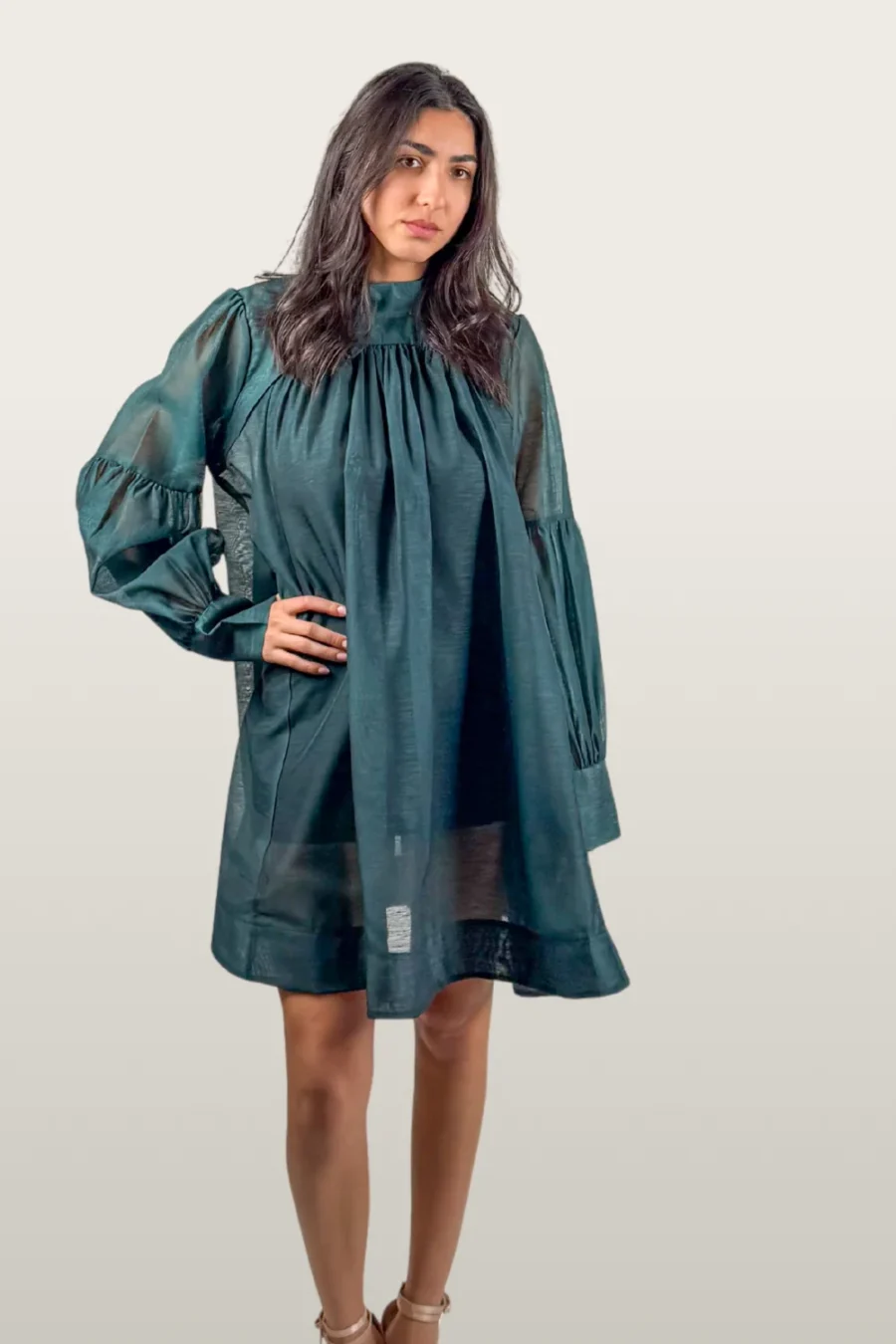שמלת טוניקה אלגנטית בגוון בירוק עמוק, עשויה מבד שיפון אוורירי בעל מראה עשיר אך קליל. הגזרה המשוחררת נאספת בקפלים עדינים בחלקה העליון, עם שרוולים תפוחים ואם תרצו, קשר במותן להדגשת קו הגוף. שילוב מושלם של נינוחות אלגנטית ונוכחות מרשימה – מתאימה מהיום ועד ערב.