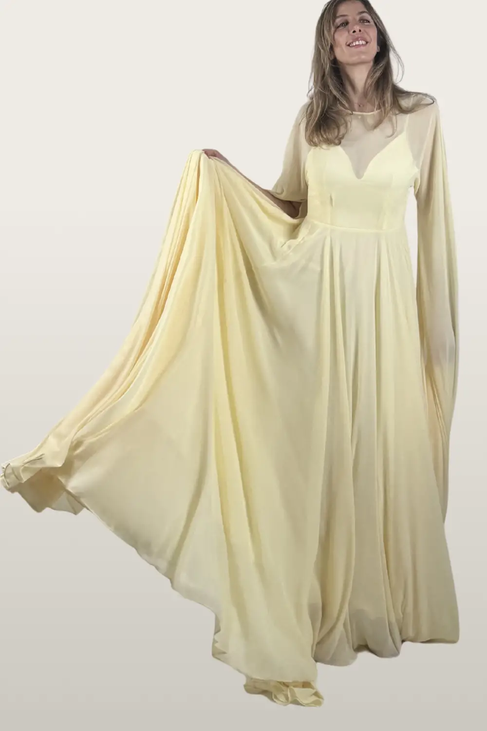 הבד נשפך ברכות, והשרוולים הארוכים נפתחים ככנפיים ויוצרים מראה מלא הוד והשראה.