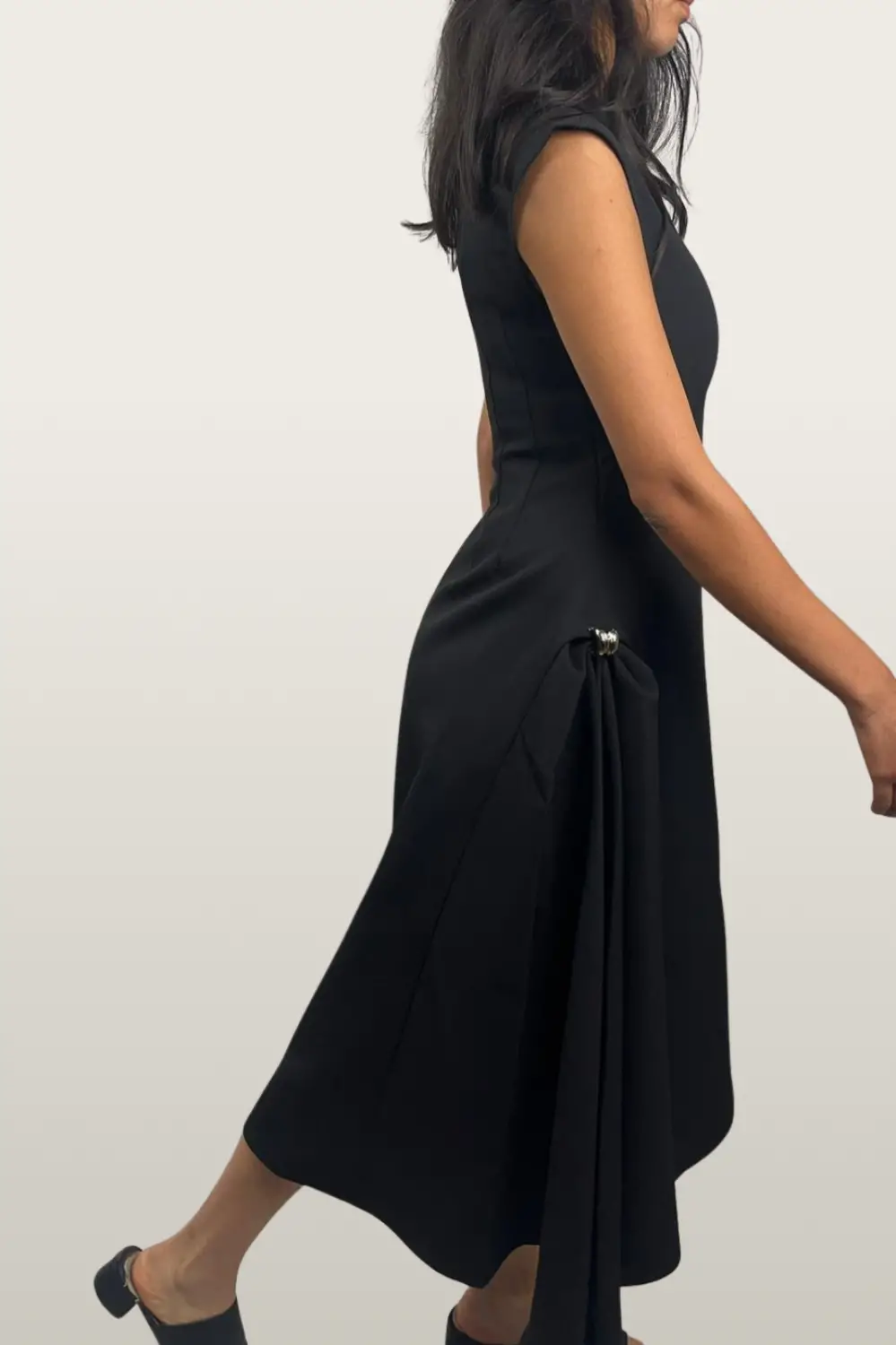 שמלת CHOCO הארוכה מציגה גזרה חדשנית וייחודית, המשלבת צווארון קולר אלכסוני עם קישוטי סיכות דקורטיביות בצדי החצאית היוצרות נפח אמנותי וצללית דרמטית. שמלה זו מהווה הצהרה אופנתית אלגנטית ובלתי מתפשרת, המכניסה רוח רעננה ויוקרתית לסצנת האופנה המקומית ומבטיחה נוכחות בלתי נשכחת.